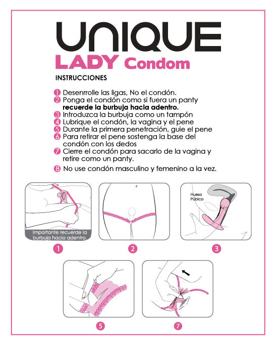 Preservativo feminino lubrificado; Com bolha de ar como mecanismo de retenção interno e delicados fechos de renda que simulam ligas. Muito fácil e confortável de inserir.